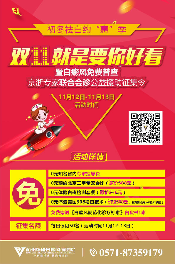 為了避免更多的患者自身忽視出現(xiàn)的白斑,避免對白斑漏診、誤診,避免錯誤的診療帶來白斑擴(kuò)散,幫助更多的患者通過科學(xué)、正規(guī)的診療方法達(dá)到祛白的目的,浙江省白癜風(fēng)規(guī)范化診療示范單位--杭州華研白癜風(fēng)病醫(yī)院特此開展"初冬祛白約'惠'季--雙11就是要你好看暨白癜風(fēng)免費(fèi)普查/京浙專家聯(lián)合會診公益援助征集令"活動.借此冀望廣大白癜風(fēng)患者真實(shí)感受到華研帶給患者的不僅僅是冰冷技術(shù),更多是有溫度的人心和有力度的折扣!